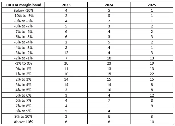 - companies below -10% EBITDA fell from 4–5 firms in prior years to just 1 firm in 2025